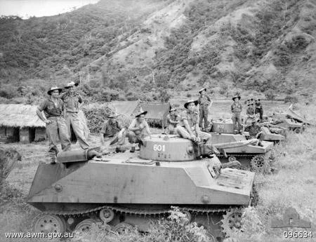 Soldiers of Australian 37/52 Infantry Battalion posing with captured Japanese Type 2 Ka-Mi amphibious tanks without their floatation devices near Lakunai airstrip and Rabaul, New Britain, Solomon Islands; September 14, 1945