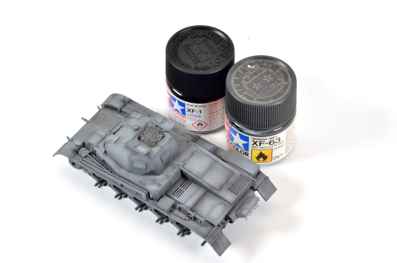 Once the primer coat had time to dry, the base colour of a lightened German Grey was applied. A further lightened mix was applied to various panels and horizontal surfaces. I purposely painted this layer lighter than you may expect.