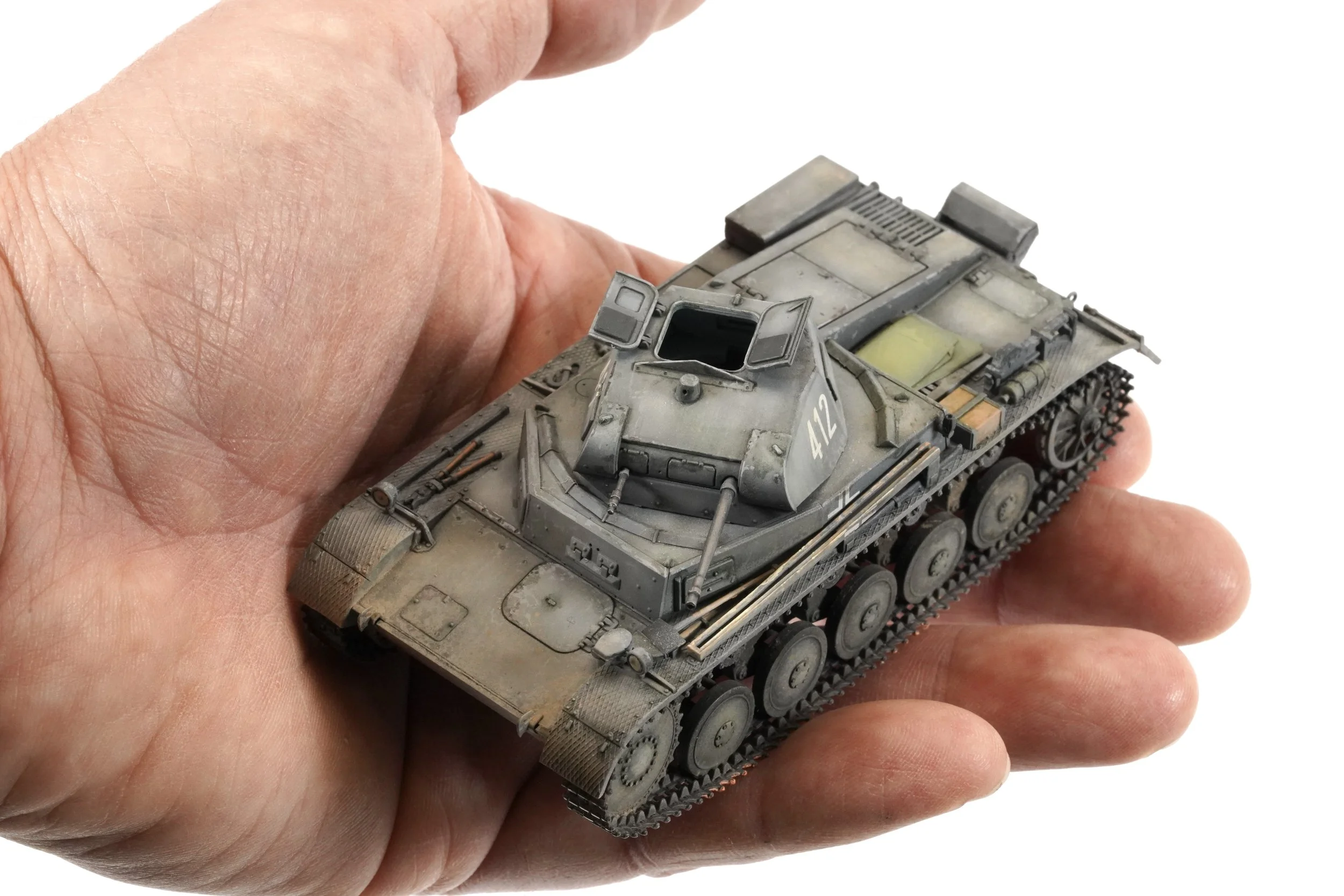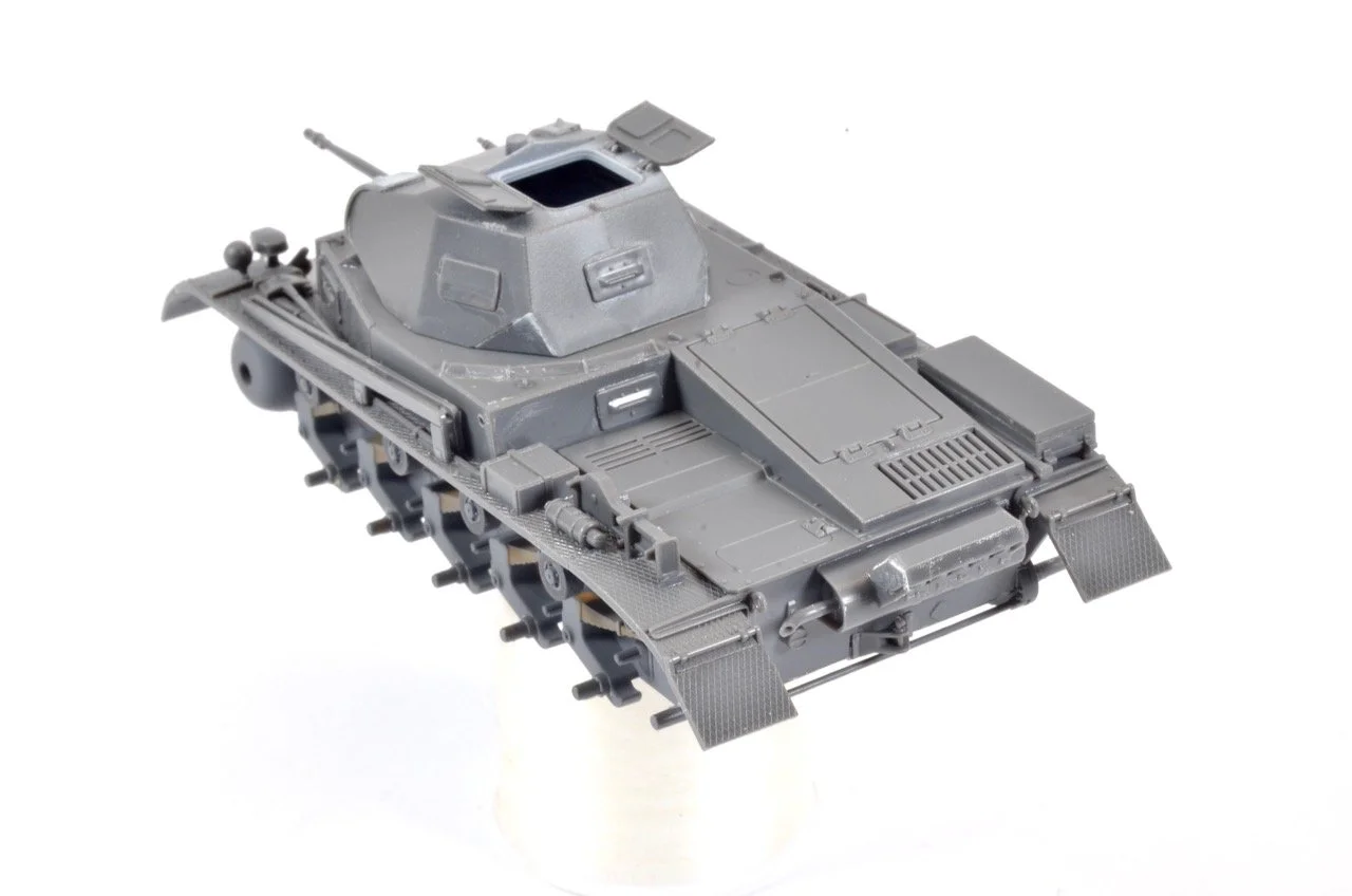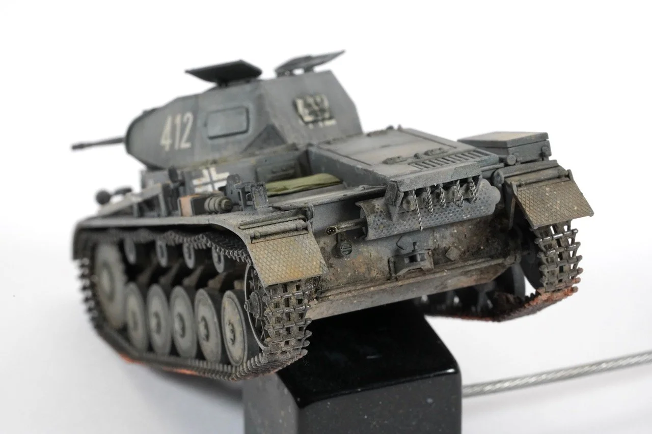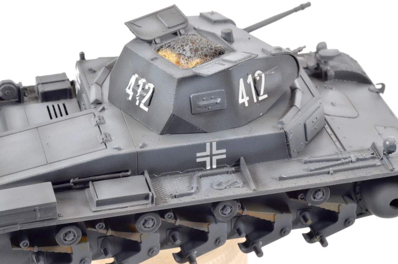The top section of the model is built and attached to the hull and then the turret twists in place. The Panzer II was taking shape. The exhaust and smoke discharger was also glued in place.