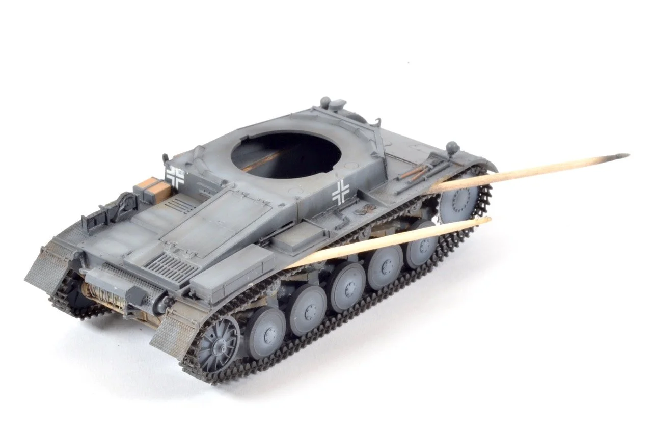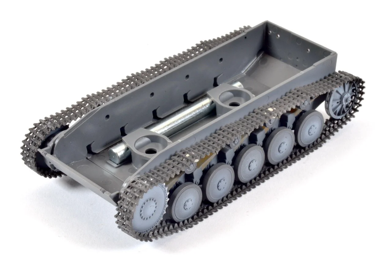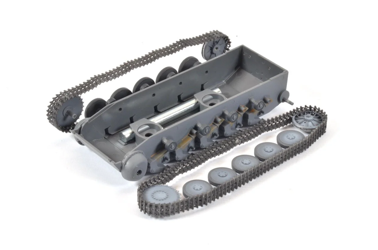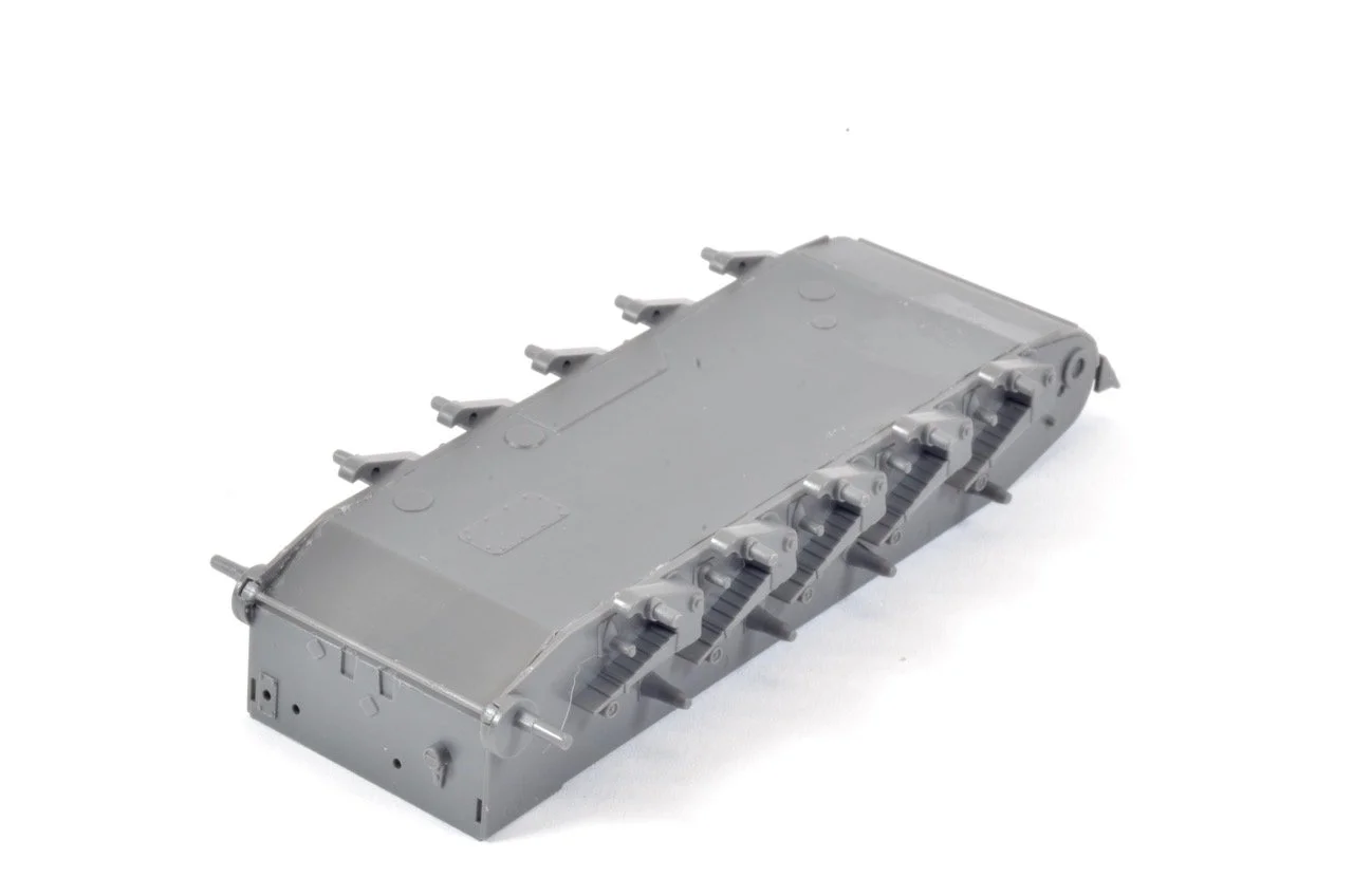 …by doing that the complete wheel and track sections could be removed for better access for painting and weathering. The sections are fragile, so a little care is required. The track sections are set aside and construction on the top side and turret were now ready to commence.