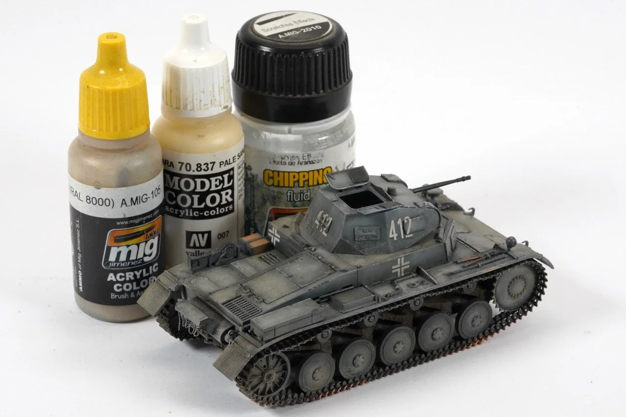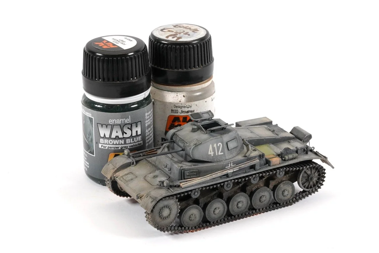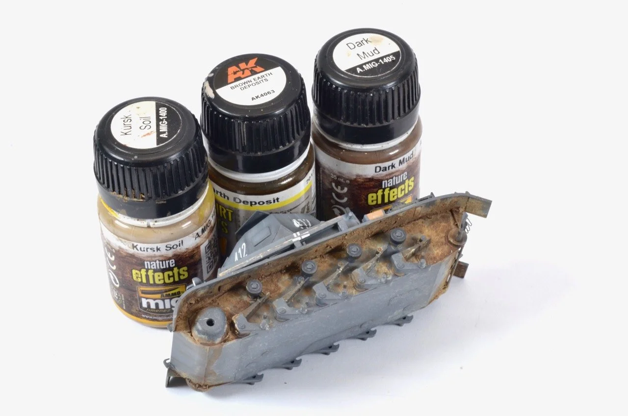 AK Dry Ground was used to create the textures around the track guards and on the underside of the model. The product is a water-based paste and is easily blended using tap water. The colour is unimportant because the effect will be integrated into the model using enamel paints.