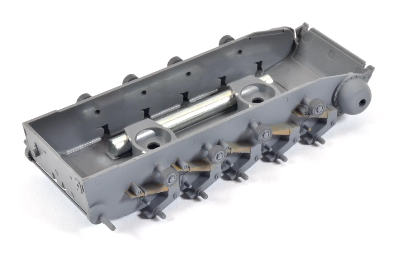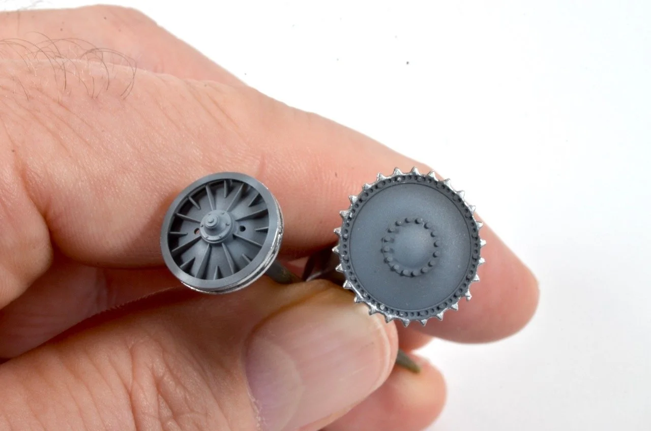 The idler and drive wheels are brush printed with an aluminium-coloured acrylic paint. The silver, once weathered will represent the parts of the wheels that would be subject to the most wear, hence wearing them down to bare metal.