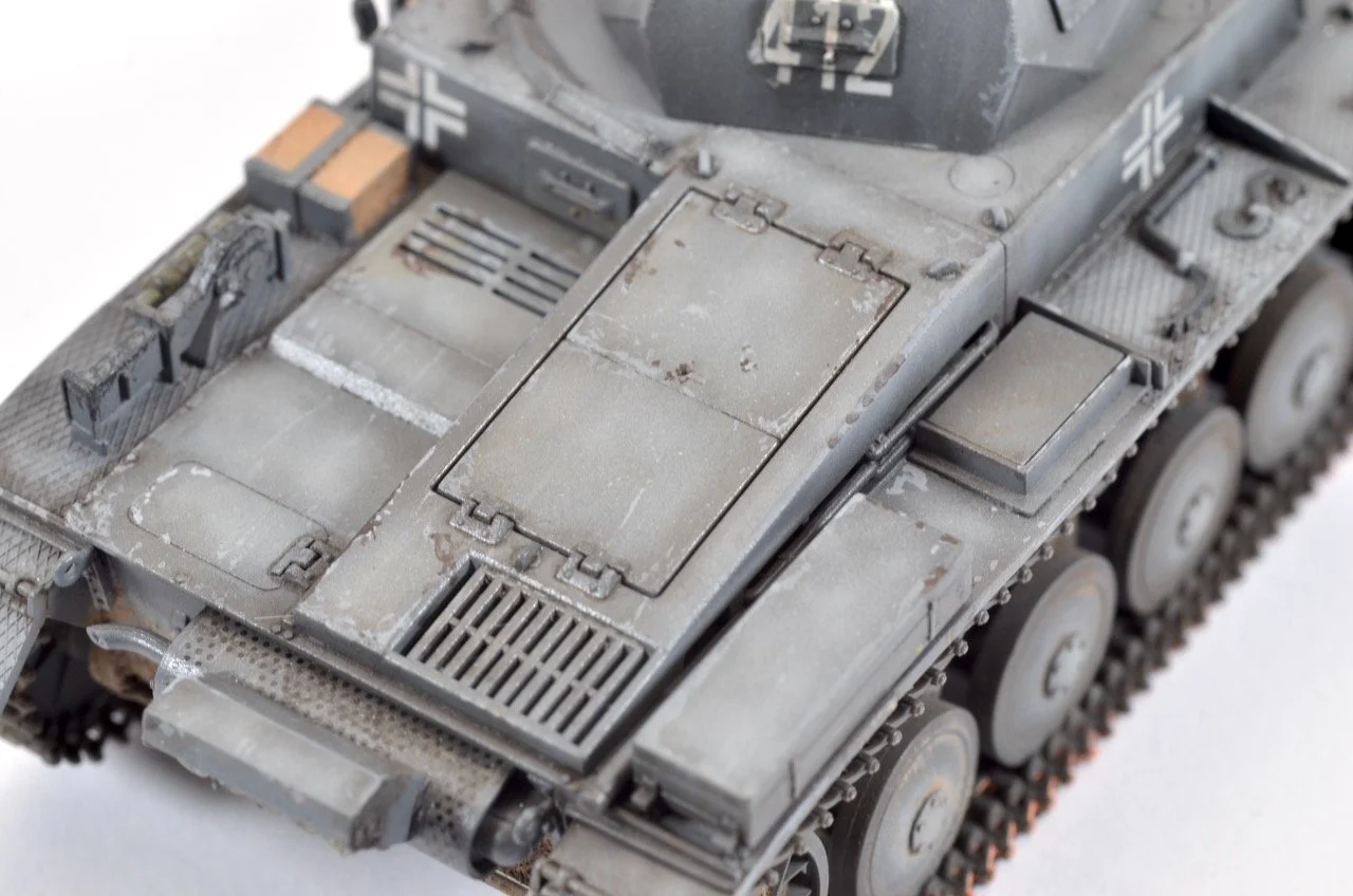 The German Grey base is perfect to apply a light dusty finish over. The initial layer was created by spraying 2 layers of chipping fluid over the entire model. A mix of Washable Dust and Pale Sand were then lightly sprayed in the logical places dust would settle on the vehicle. Horizontal areas and along the running gear.