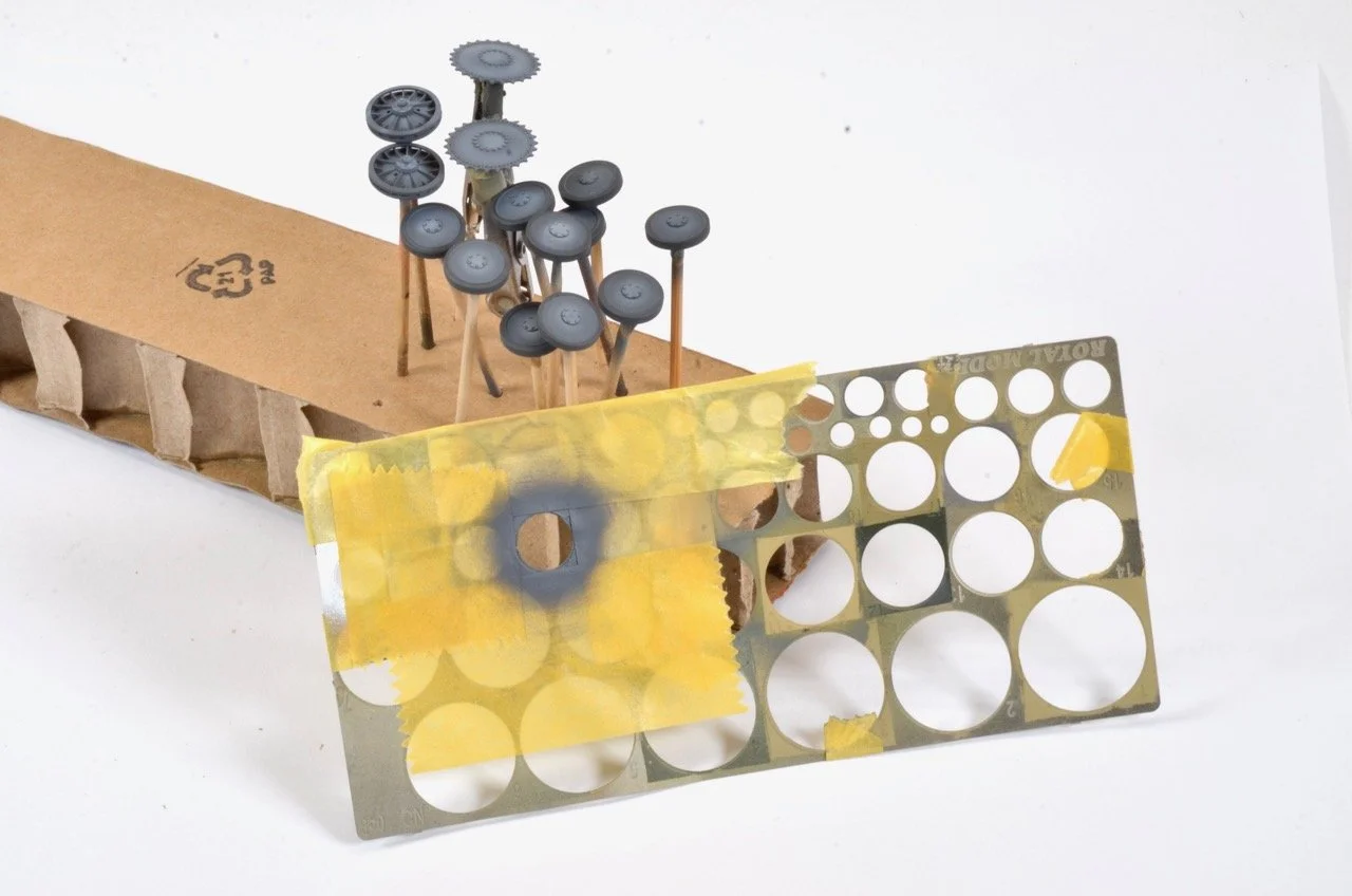One of the most useful tools on my bench is the circular spraying template for painting road wheels. The wheels (with the aid of the mask) are then sprayed with a lightened German Grey colour. The rubber sections are nicely defined, and the painting of the wheels is complete in around 10 minutes.
