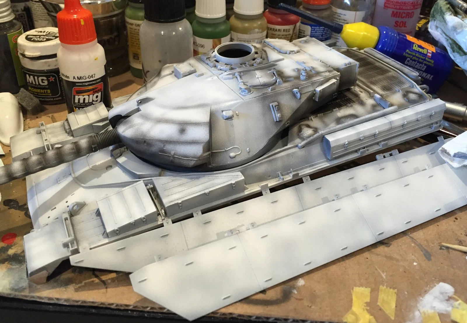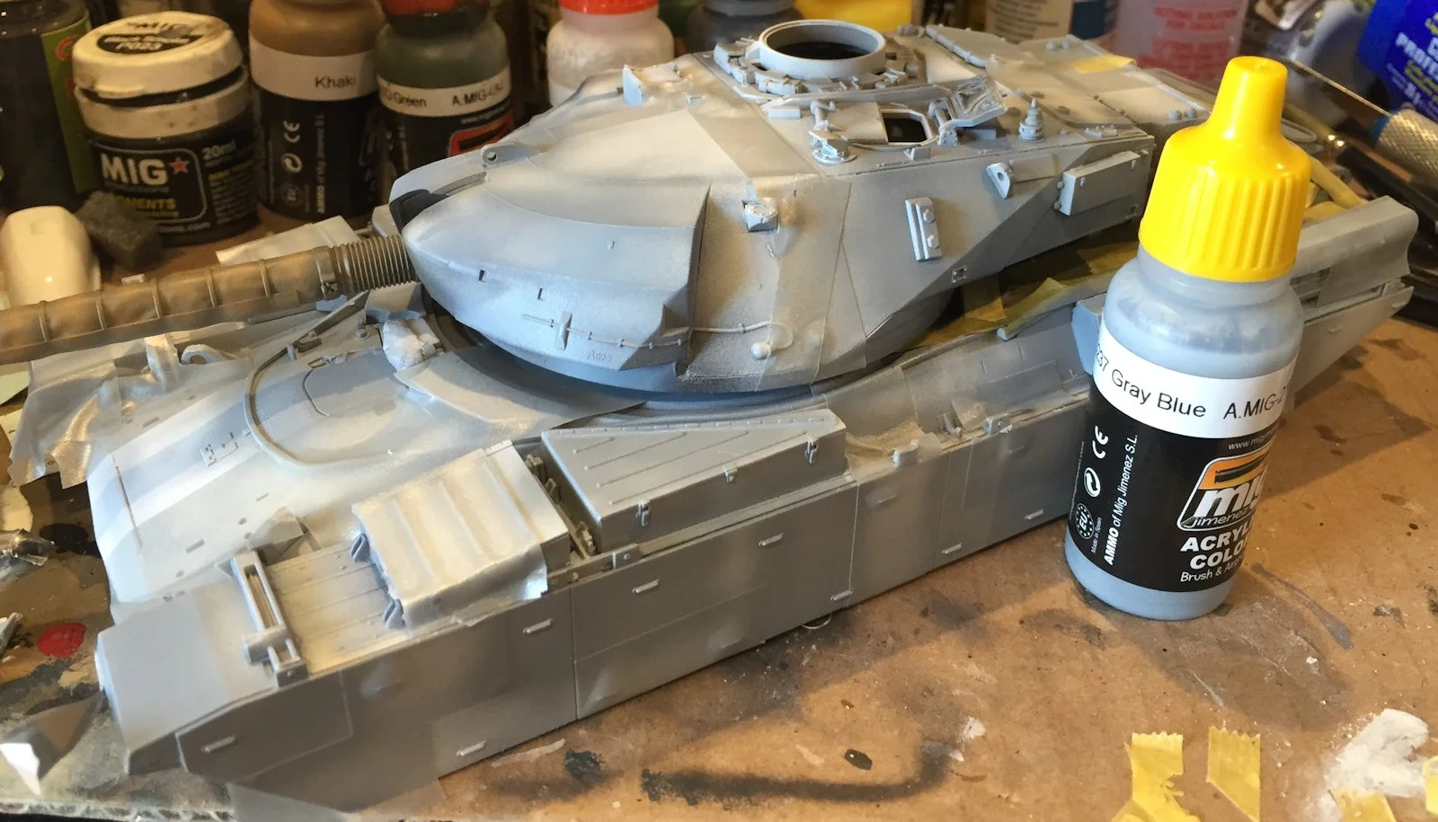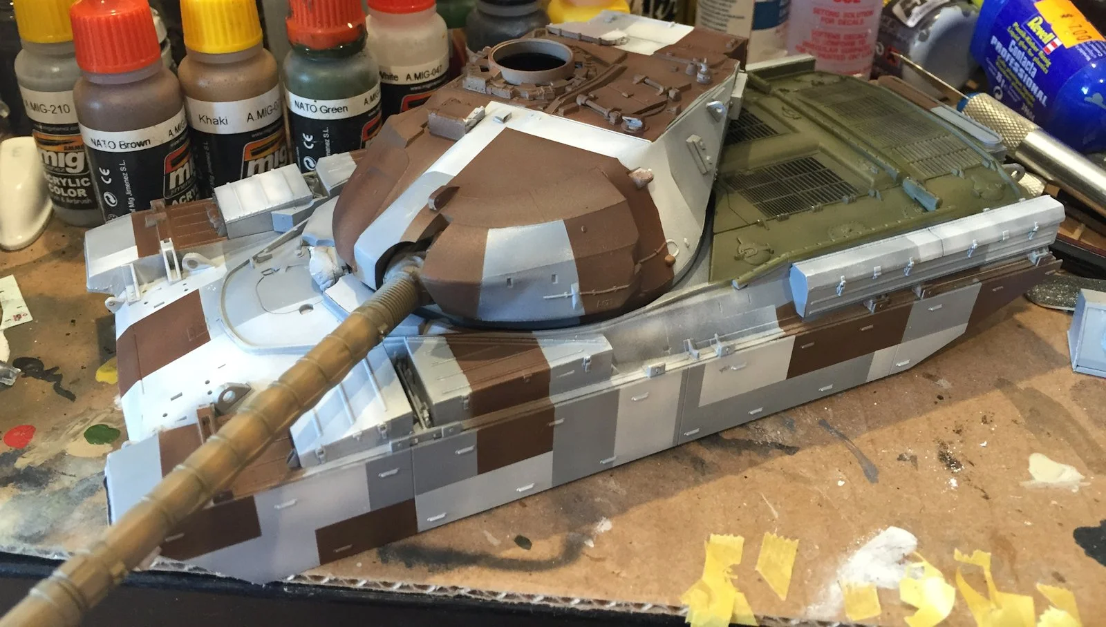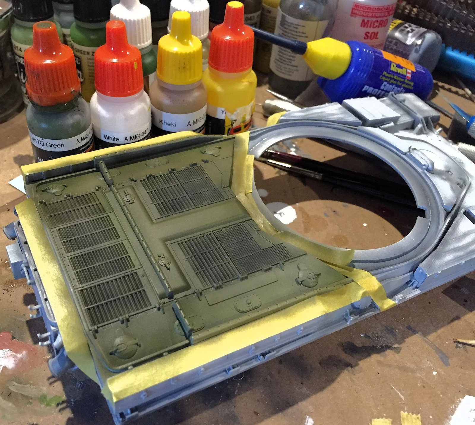 The engine deck of the model was now masked off with some Tamiya tape and painted with NATO Green (A.MIG084). Tonal variation was achieved by mixing the base colour with white, yellow and even Khaki.