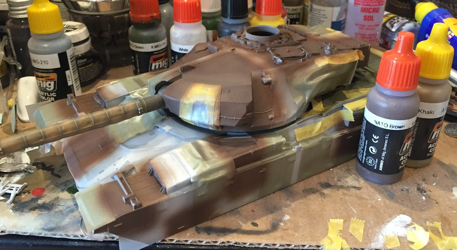 The second part of the mask set is now stuck in place and a coat of AMMO’s NATO Brown (A.MIG 085) is applied. Tonal variation is achieved by lightening this colour with Khaki and thinning the mix considerably with Mr. Color Levelling thinner. Again, masking tape is used to help settle the masks and ensure sharp results.